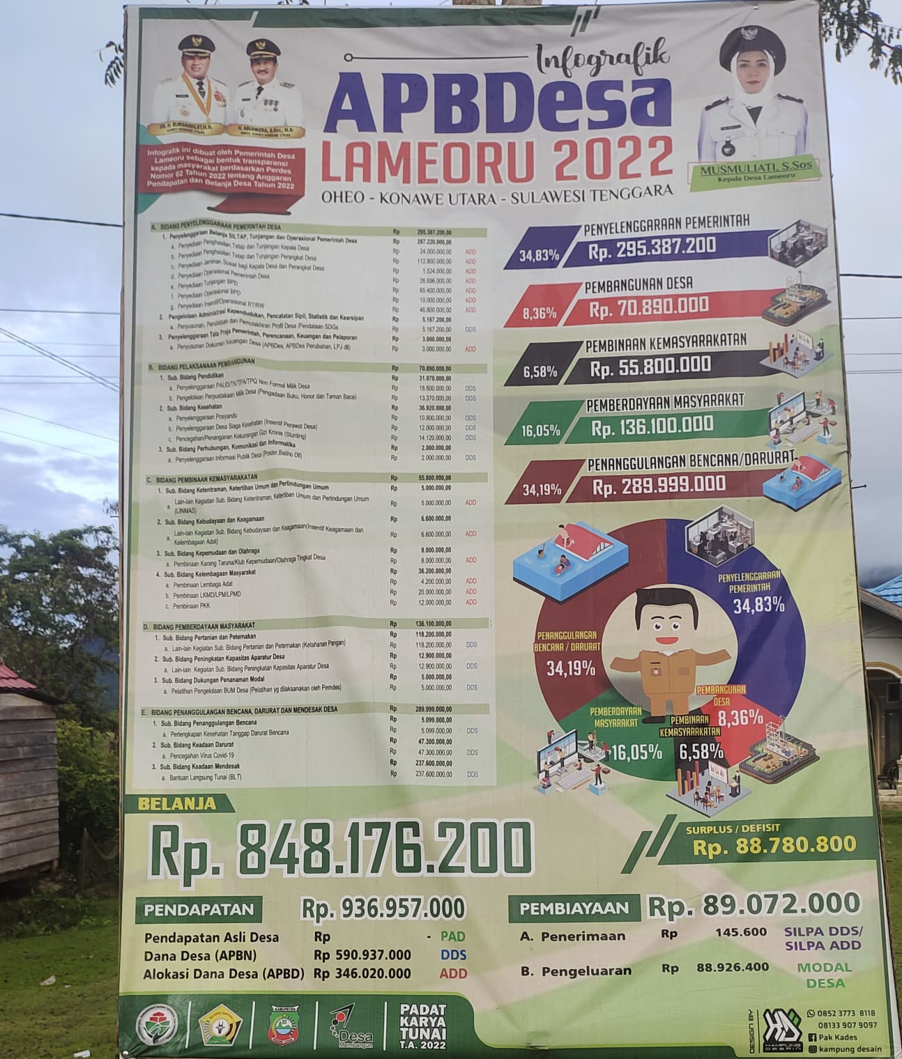 Diungkapkan, anggaran yang turun di Desa Lameoru yakni dari APBN Dana Desa (DD) Sebesar Rp590.937.000 dan Alokasi Dana Desa (ADD) Pemkab Konut, senilai Rp346.020.000.