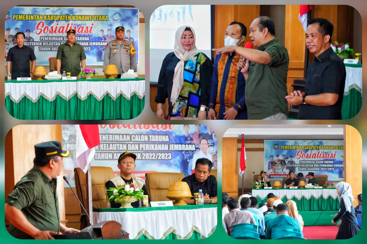 Kali ini Pemkab Konut, melalui Dinas Perikanan yang bekerja sama dengan Kementerian Kelautan dan Perikanan (KKP), mengadakan sosialisasi penerimaan peserta didik Politeknik Kelautan dan Perikanan (KP) Jembrana, Tahun Ajaran 2022/2023, di aula lantai 1 Anawaingguluri Kantor Bupati Konut, Jumat (5/8/2022).