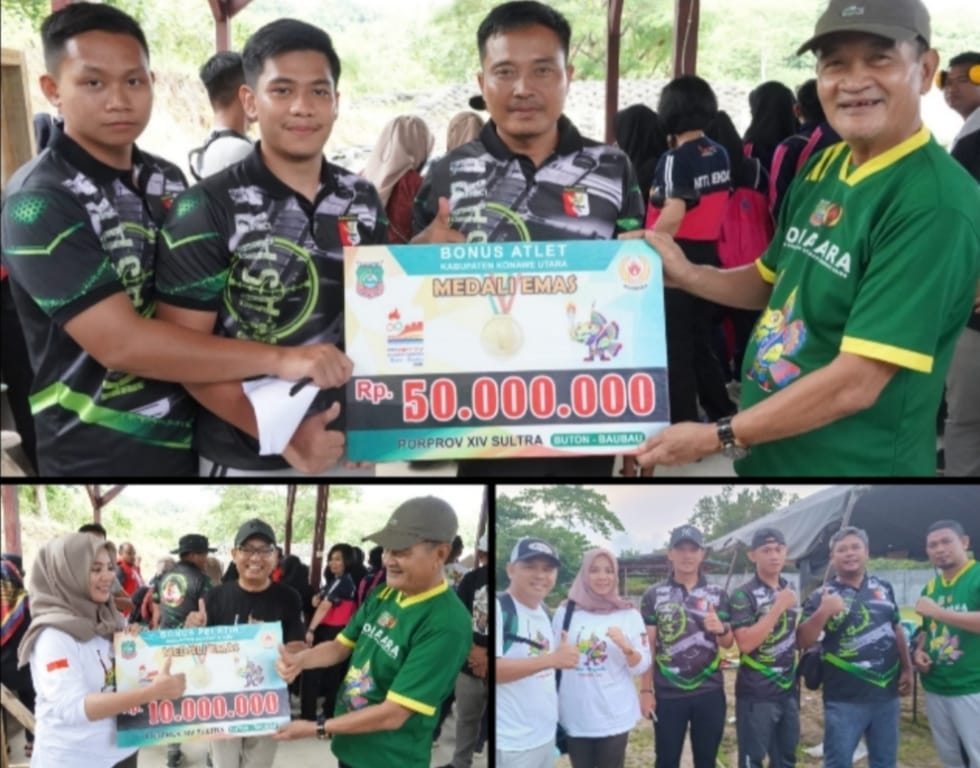 Para peraih medali, langsung menerima penyerahan bonus secara simbolis di tempat pertandingan oleh Bupati Konut, Ruksamin yang diwakili Ketua KONI Konut, Abu Haera, didampingi Sekda Konut, Kasim Pagala, serta jajaran Organisasi Perangkat Daerah (OPD).