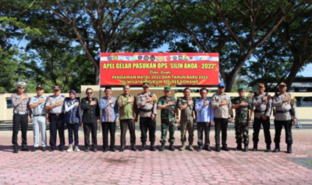 Konawe, Rakyatpostonline.Com – Dalam rangka memberikan rasa aman dan nyaman pada perayaan Natal dan Tahun Baru (Nataru) 2023, Polres Konawe bersama TNI dan Pemda melaksanakan apel gelar pasukan Operasi Lilin Anoa, Jumat (22/12/2022).