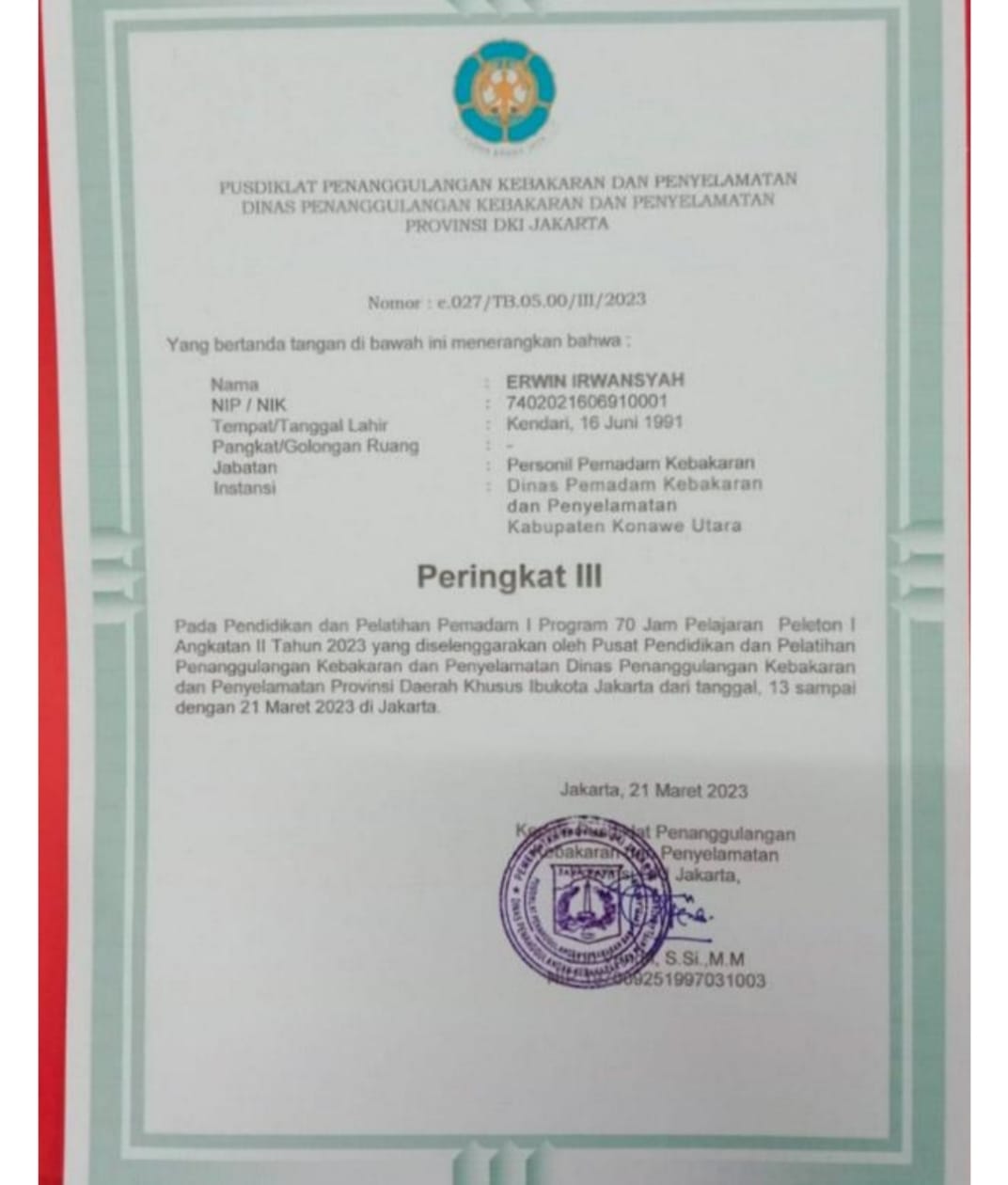 Prestasi itu diraih atas ketangguhan dan kegigihan, serta menampilkan performa terbaik selama mengikuti pendidikan. Penghargaan resmi diberikan oleh pimpinan Damkar Pusat dengan Nomor E 027/ TB. 05.00/lll/2023.