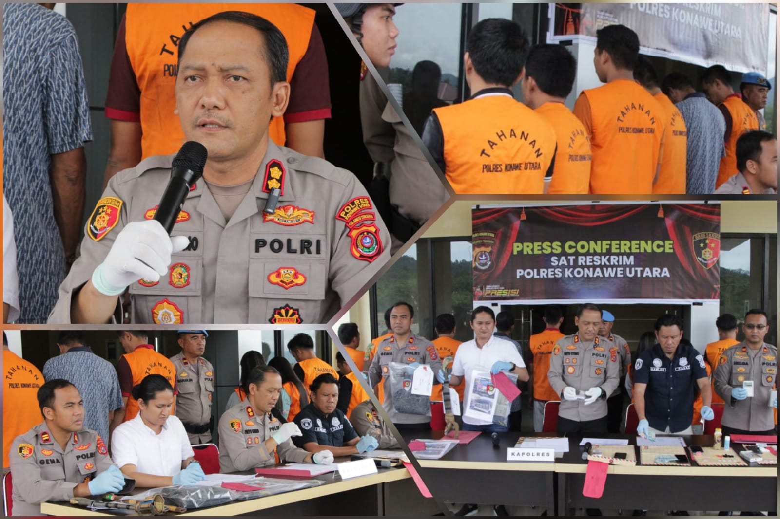 Ketgam : AKBP Priyo Utomo bersama jajaran Polres Konut berhasil mengungkap dan mengamankan pelaku tindak pidana melalui konferensi pers di Mako Polres. Rabu, (05/04/2023). (*Ist/RP)