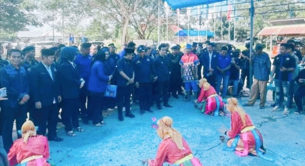 Kedatangan rombongan begitu meriah karena diiringi tarian Adat Mondotambe Suku Tolaki, di depan gedung Aula Kantor KPU Kabupaten Konawe.
