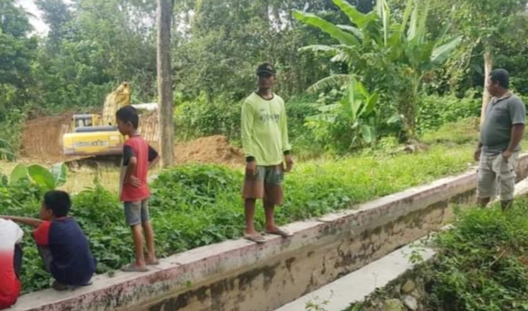 Alat berat jenis ekskavator diturunkan demi memaksimalkan perbaikan bendungan. Warga turut serta menyaksikan pekerjaan tersebut.