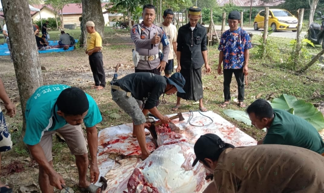 Kapolres Koltim bersama jajarannya dan tokoh masyarakat, turut membagikan daging kurban secara langsung, sambil menyampaikan pesan kebersamaan dan semangat berbagi dalam suasana Iduladha.