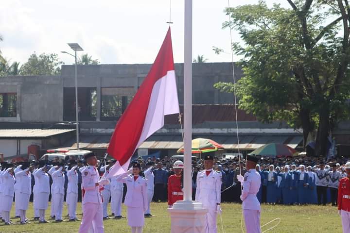 Pengibaran bendera dilakukan oleh 73 siswa siswi dari berbagai SMA sederajat lingkup Kabupaten Koltim. Siswi SMA Negeri 1 Ladongi, Novita Adelia yang terpilih sebagai pembawa Baki Bendera.