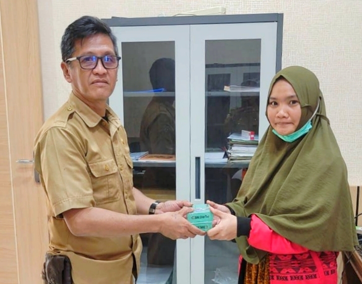 Kepala Bidang dan Rehabilitasi Sosial (Rehsos) Dinsos Konut, Isobar Lotunani S.Sos menyerahkan bantuan alat pendengar kepada penerima manfaat.