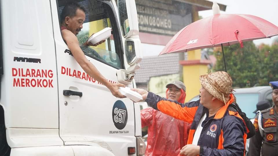 Tidak hanya meninjau, Bupati juga berbagi kebaikan dengan membagikan makanan kepada para pengguna jalan yang terjebak antrian akibat banjir.
