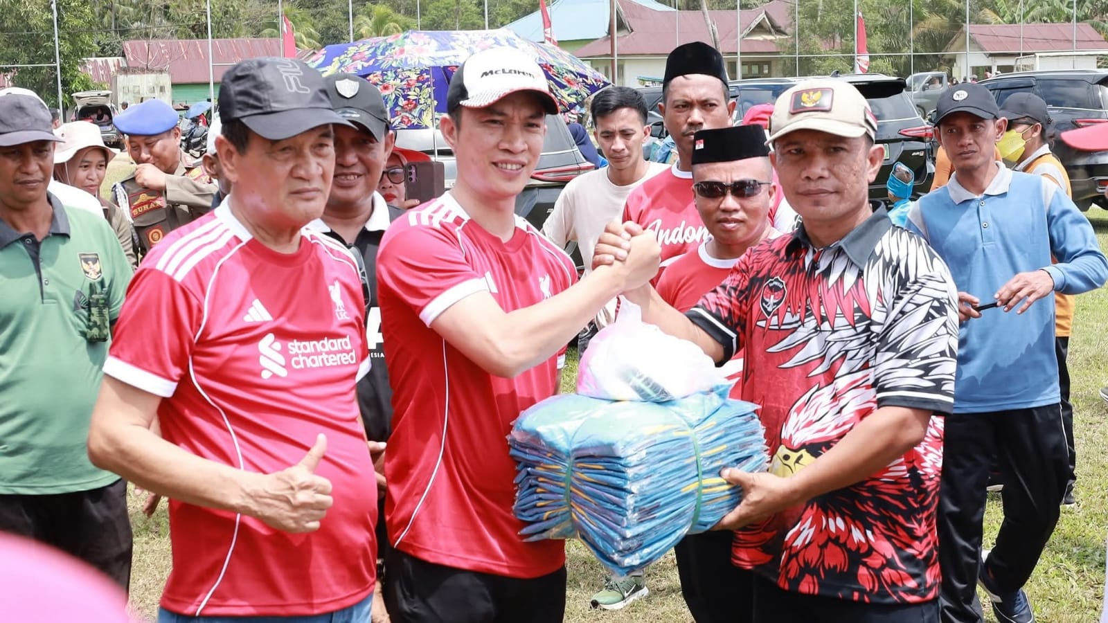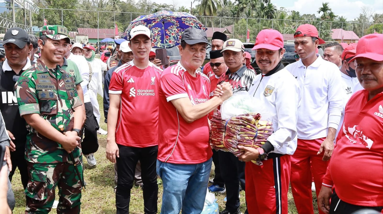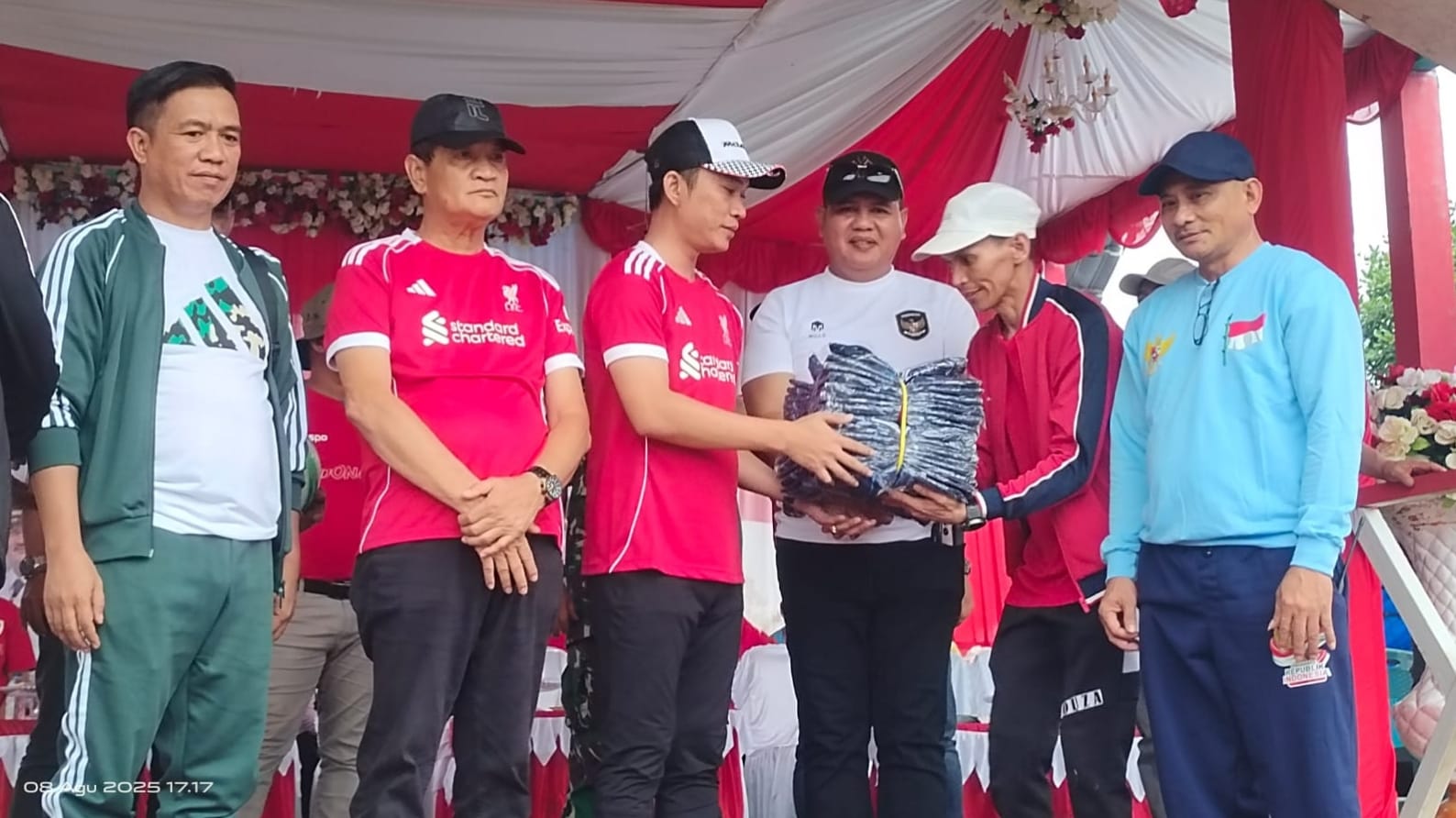 Wakil Ketua II DPRD Konawe Utara (Konut), Muhardin, S.Pd, menyerahkan seragam Porseni di Lapangan Hadaasi, Kecamatan Andowia, Kabupaten Konawe Utara, Jum'at (08/08/2025).