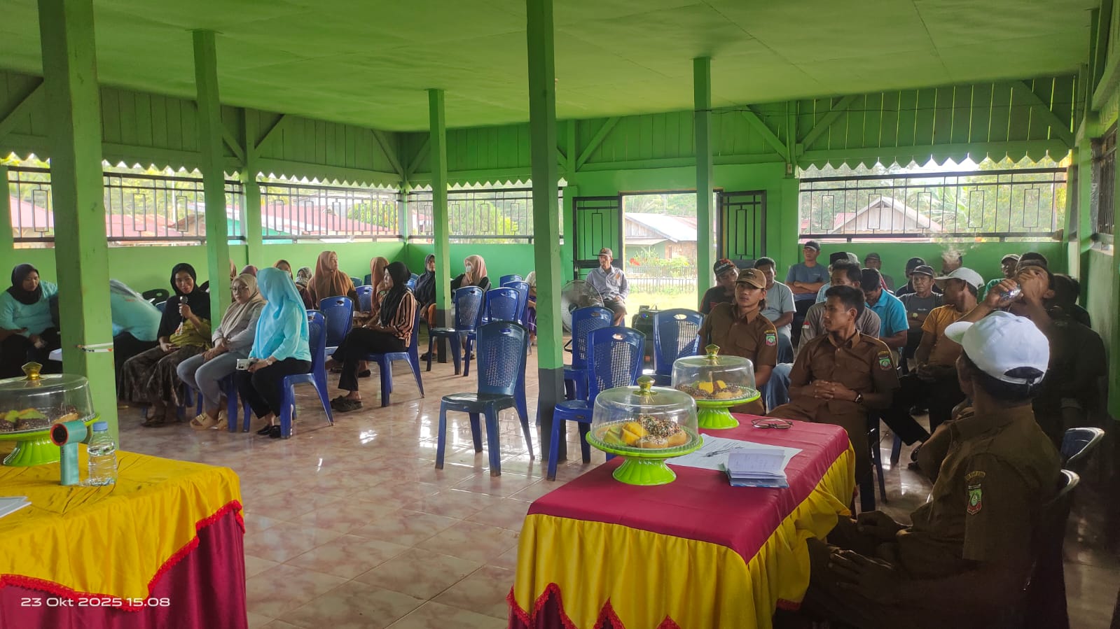 Peserta Musdes Desa Paka Indah, terdiri dari perangkat desa, BPD, kader, dan masyarakat, aktif mengikuti jalannya pembahasan RKPDes dan pencegahan stunting, Rabu (23/10/2025).