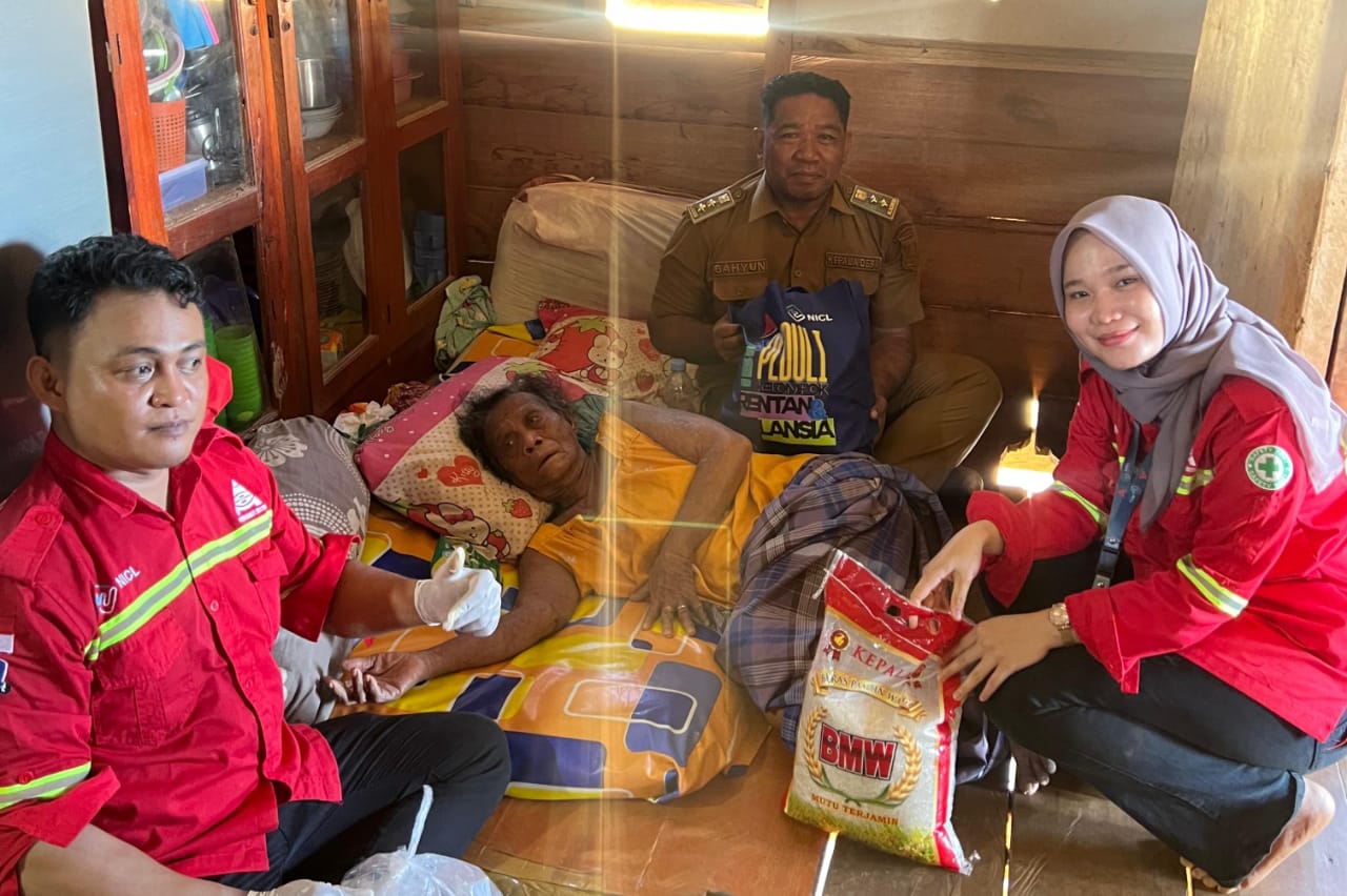 Tim medis dan CSR PT IBM bersama aparat desa menyerahkan bantuan serta melakukan pemeriksaan kesehatan kepada lansia yang sakit di rumahnya, sebagai bagian dari Program Peduli Kelompok Rentan dan Lansia.