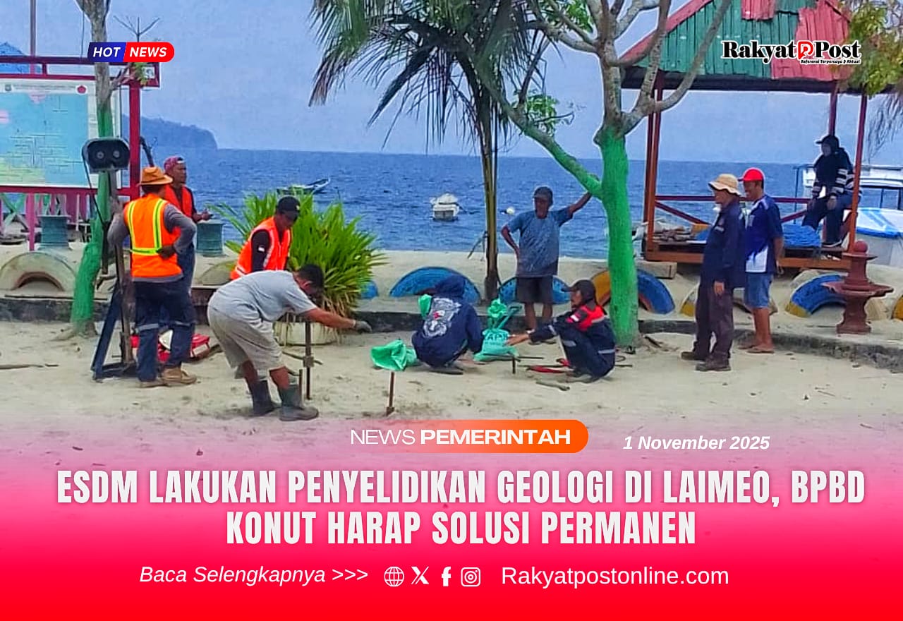 Konawe Utara, Rakyatpostonline.com – Kementerian Energi dan Sumber Daya Mineral (ESDM) melalui Badan Geologi melakukan penyelidikan geologi teknik terhadap bencana abrasi yang melanda pesisir Desa Laimeo, Kecamatan Sawa, Kabupaten Konawe Utara (Konut), Provinsi Sulawesi Tenggara (Sultra), pada Jumat (31/10/2025).