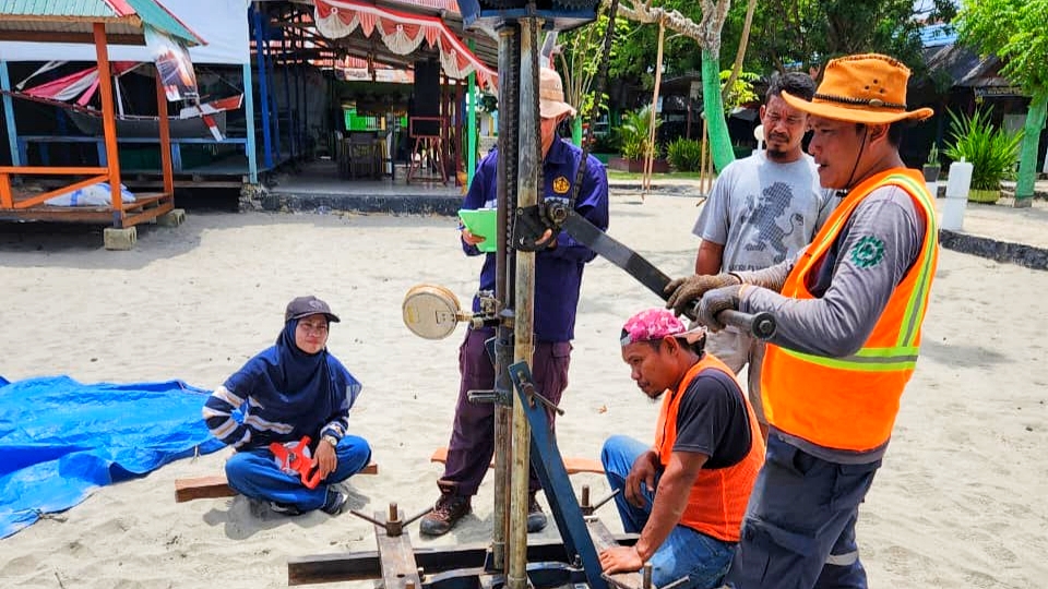 Tim teknis melakukan pengeboran dan pengambilan sampel tanah di kawasan pantai Laimeo sebagai bagian dari survei geologi untuk mitigasi abrasi.