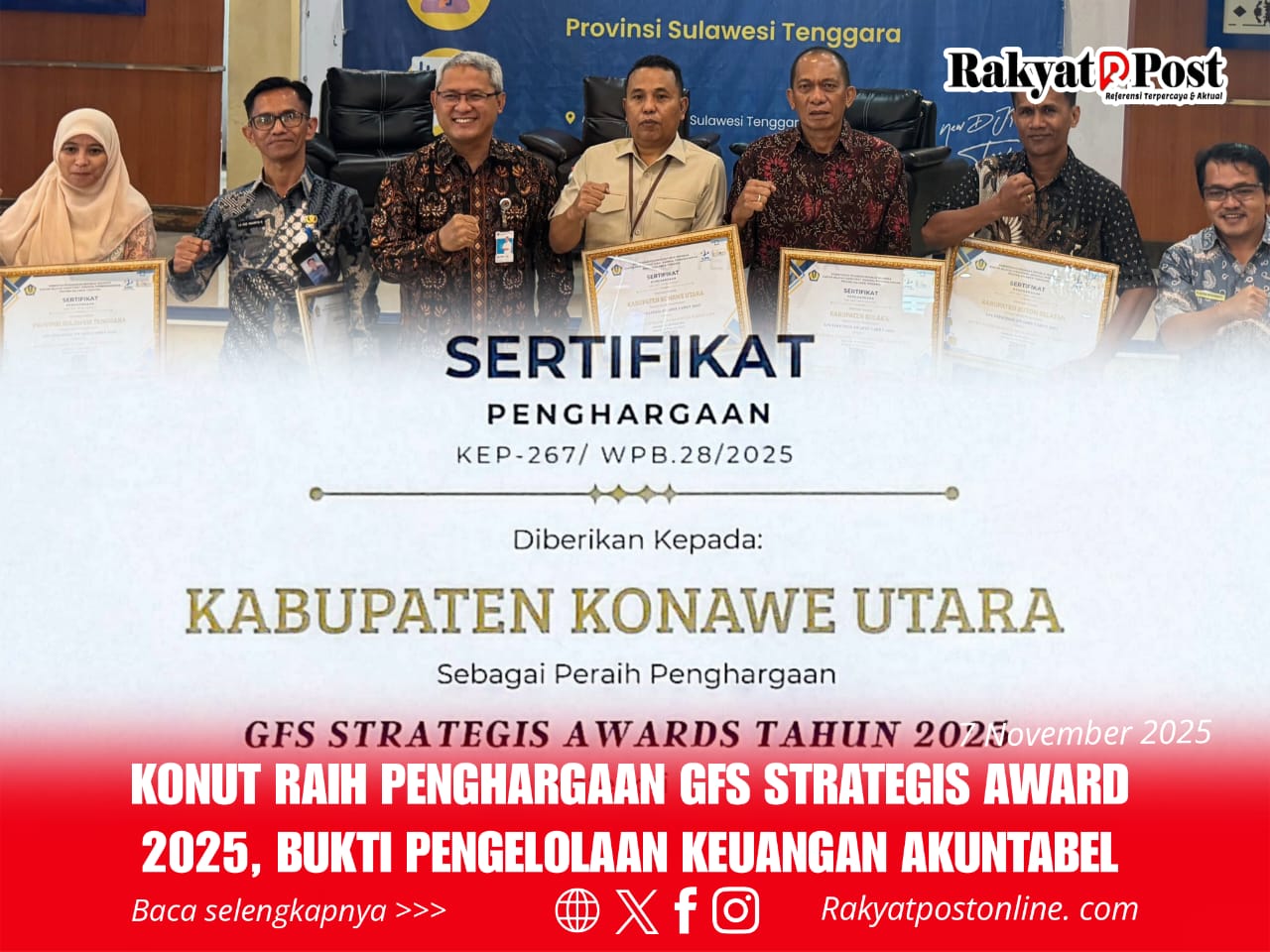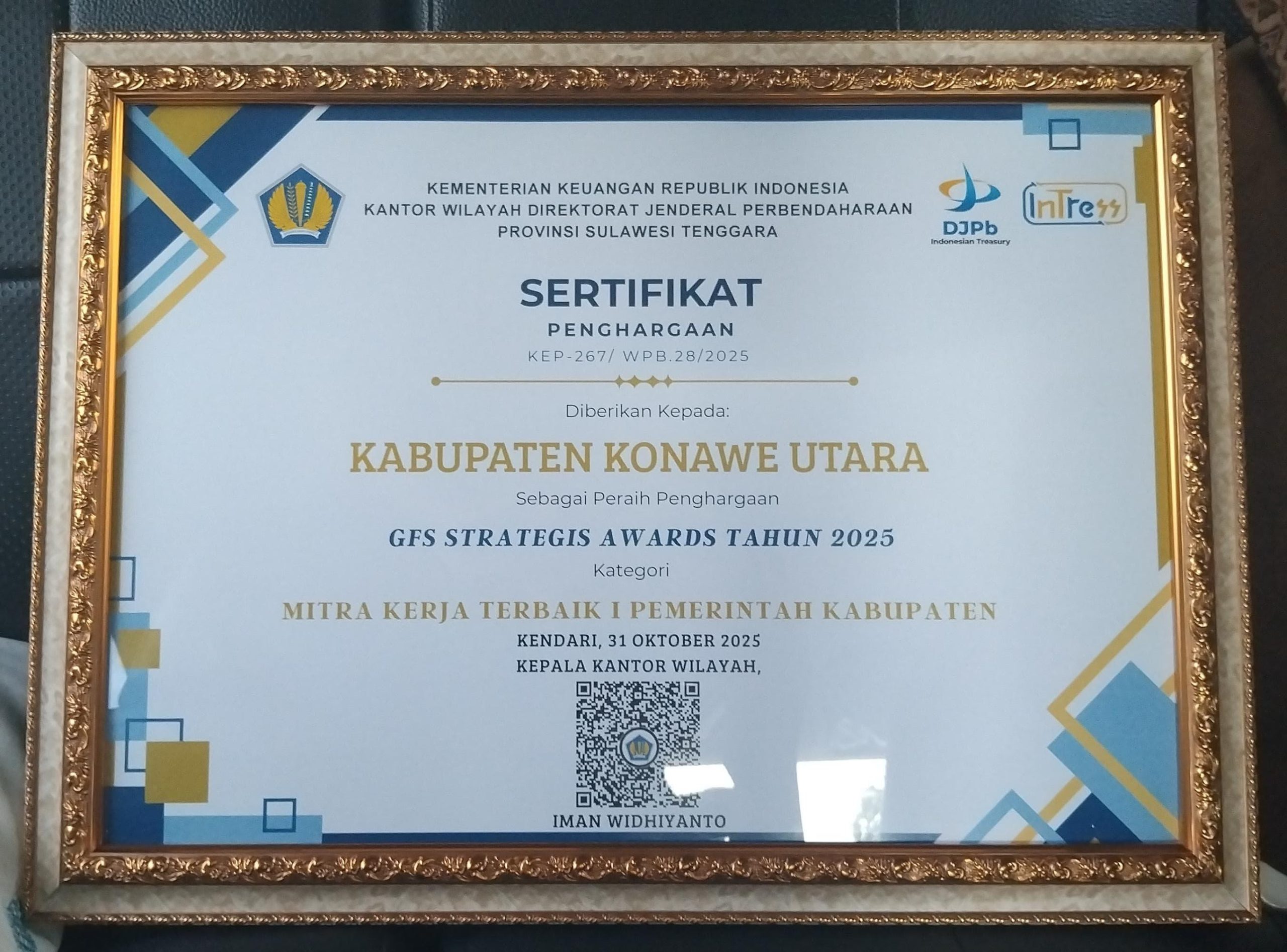 Kali ini, Pemkab Konut berhasil meraih Penghargaan GFS Strategis Awards Tahun 2025 untuk kategori Mitra Kerja Terbaik I Pemerintah Kabupaten.