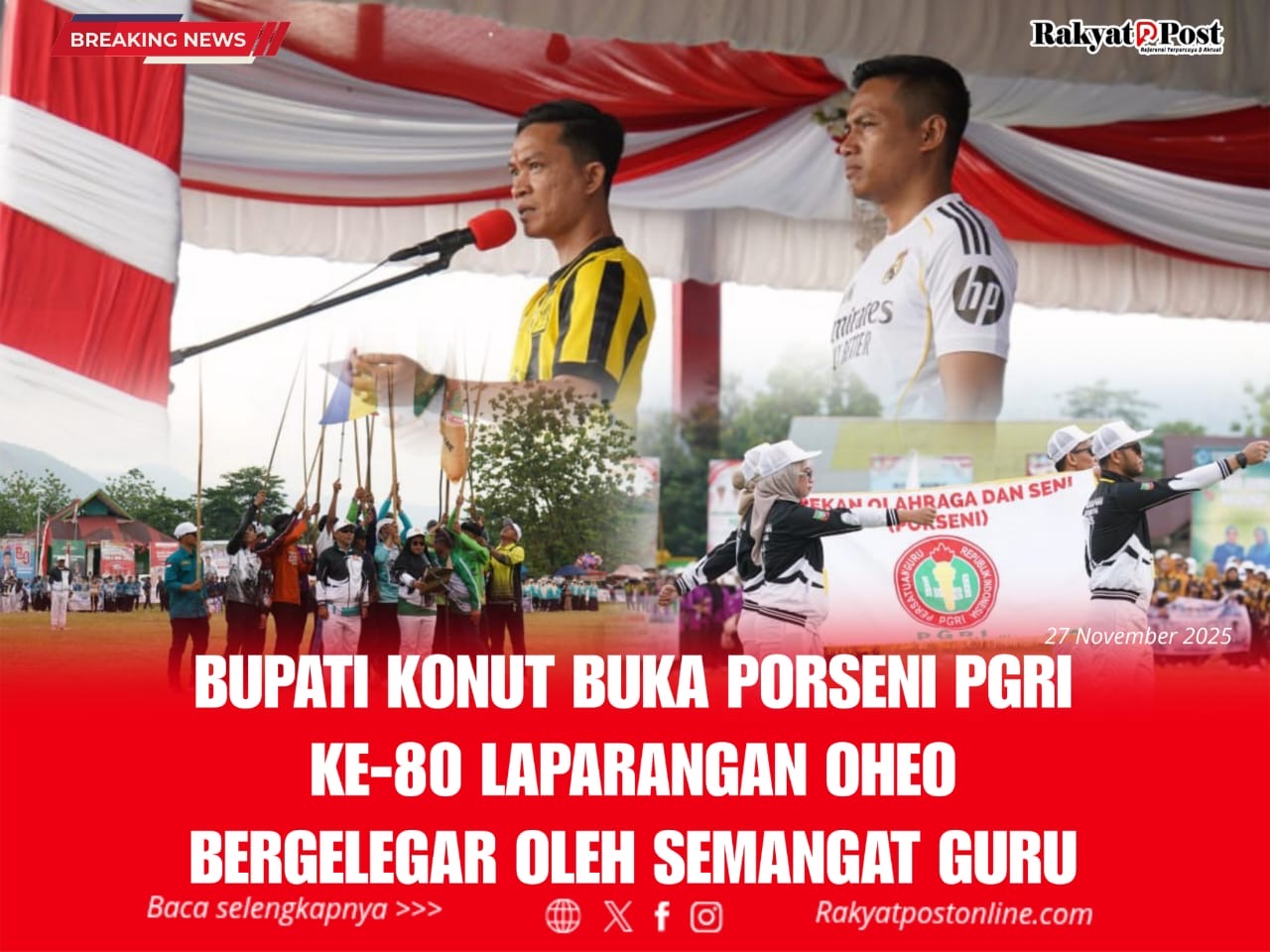 Konawe Utara, Rakyatpostonline.Com – Suasana Lapangan Kecamatan Oheo, Kabupaten Konawe Utara (Konut), mendadak berubah meriah pada Kamis (27/11/2025). Ribuan guru dari seluruh penjuru kecamatan, tumpah ruah mengikuti pembukaan Pekan Olahraga dan Seni (Porseni) PGRI dalam rangka HUT ke-80 PGRI dan Hari Guru Nasional tingkat kabupaten.
