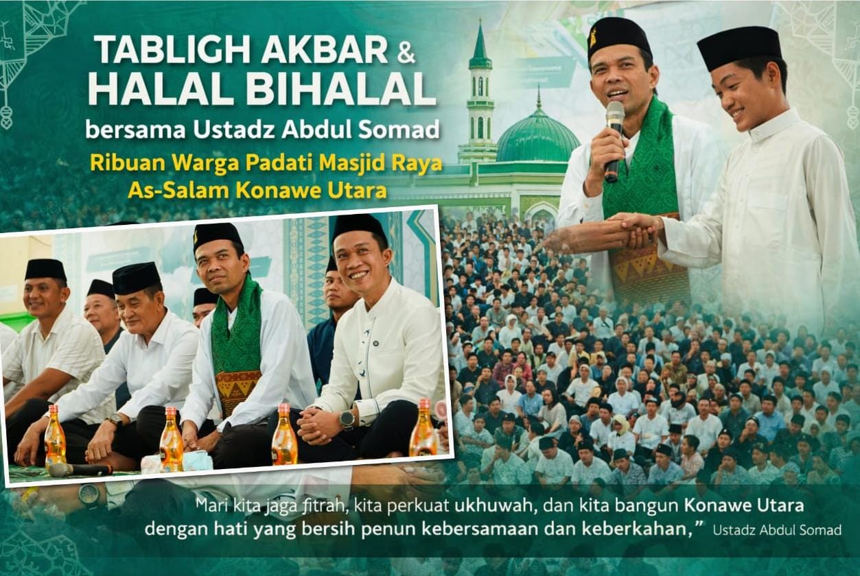 Konawe Utara, Rakyatpostonline.com – Pemerintah Kabupaten Konawe Utara sukses menggelar Tabligh Akbar Konasara yang dirangkaikan dengan Halal Bihalal bersama dai Nasional, Abdul Somad, di Masjid As-Salam, Kelurahan Wanggudu, Kecamatan Asera, Sabtu (4/4/2026).